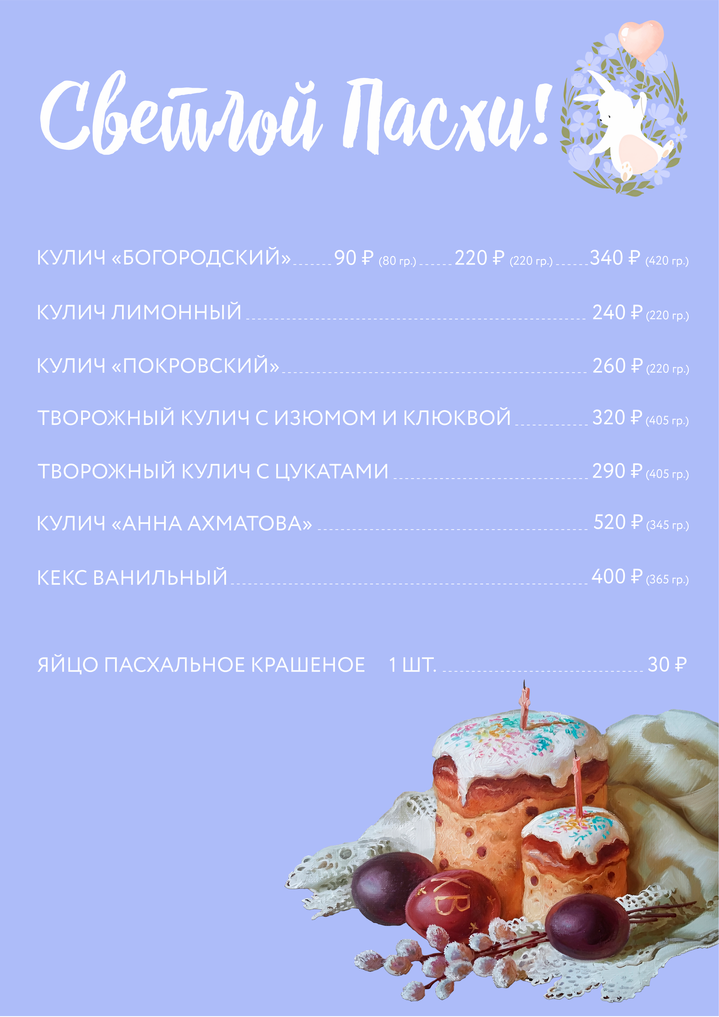 Our Easter cakes are made only from natural ingredients, and are available in various sizes, depending on your preferences. In addition to everyone's favorite classic cakes, the range includes cottage cheese, lemon cakes and delicate vanilla cupcakes. As well as our signature cakes "Pokrovsky" and dried cherry cake "Anna Akhmatova". Therefore, regardless of whether you are looking for a treat for a festive table or a gift for your loved ones, our offer is sure to please you.